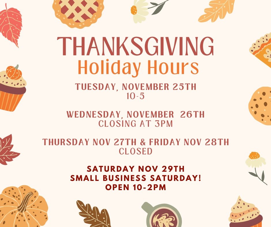 We will be closing early at 3pm on Wednesday, November 26th and will be closed all day November 27th and 28th to observe the Thanksgiving holiday.